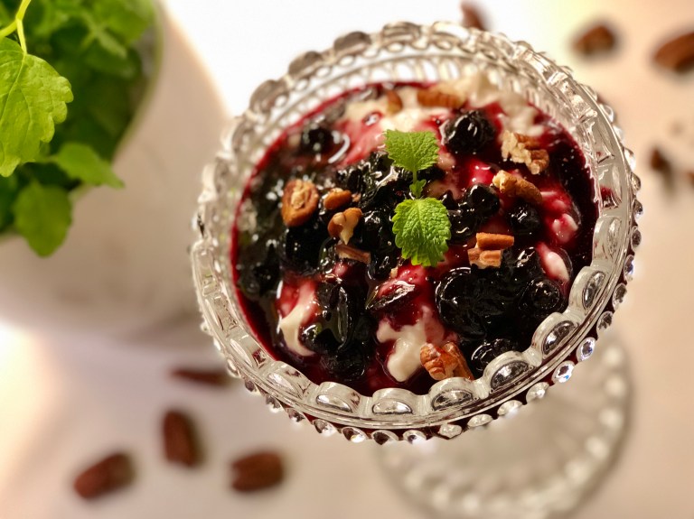 og strø over grovhakkede pekannøtterog. Pynt med sitronmelisse og nyt!