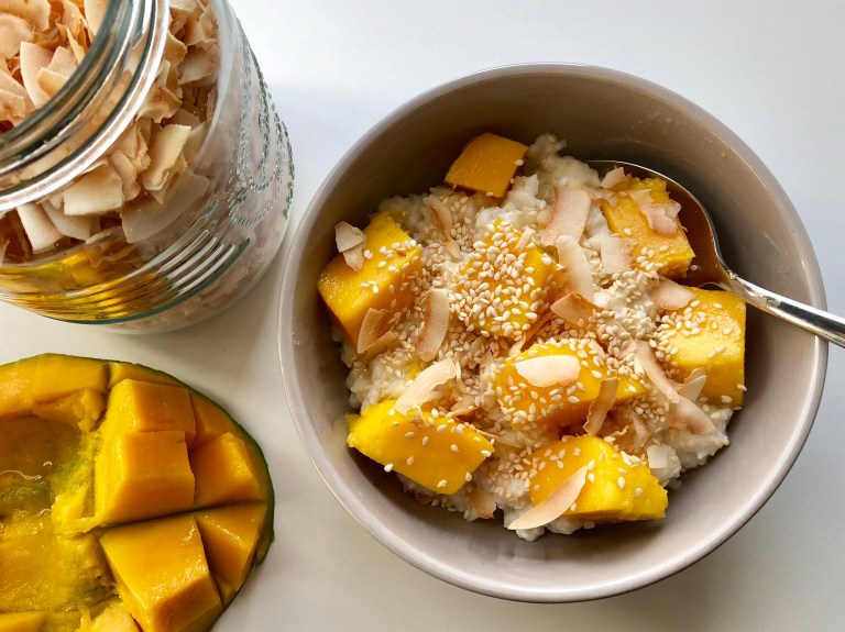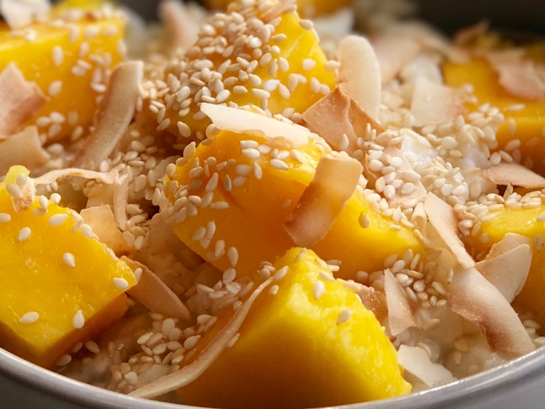 Ha grøt i en frokostbolle og topp med mangobiter, sirup, kokosflak og sesamfrø.