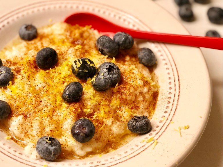 Serveres rykende varm i skåler og ha over sirup, kanel, revet sitronskall og blåbær.