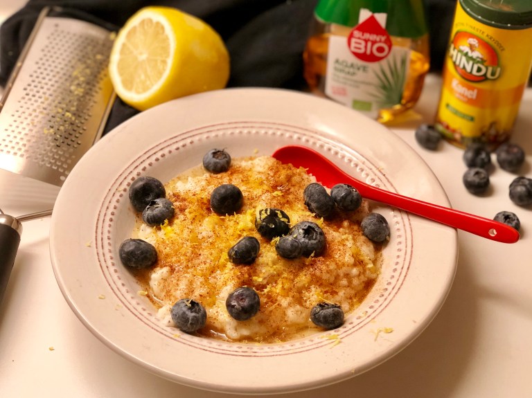 En nydelig eksotisk risengrynsgrøt med kokos og en litt annerledes topping.