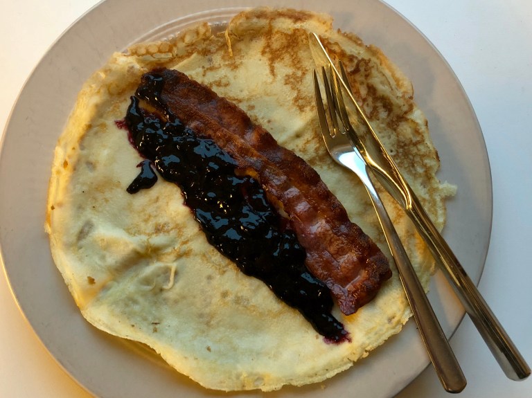 Server pannekakene med bacon og varm blåbærkompott og nyt!
