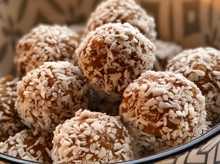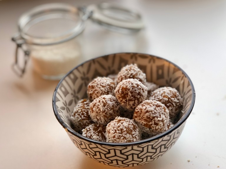 I en skål har du kokosmasse som kulene rulles i til slutt.