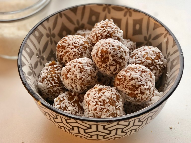 I en skål har du kokosmasse som kulene rulles i til slutt.