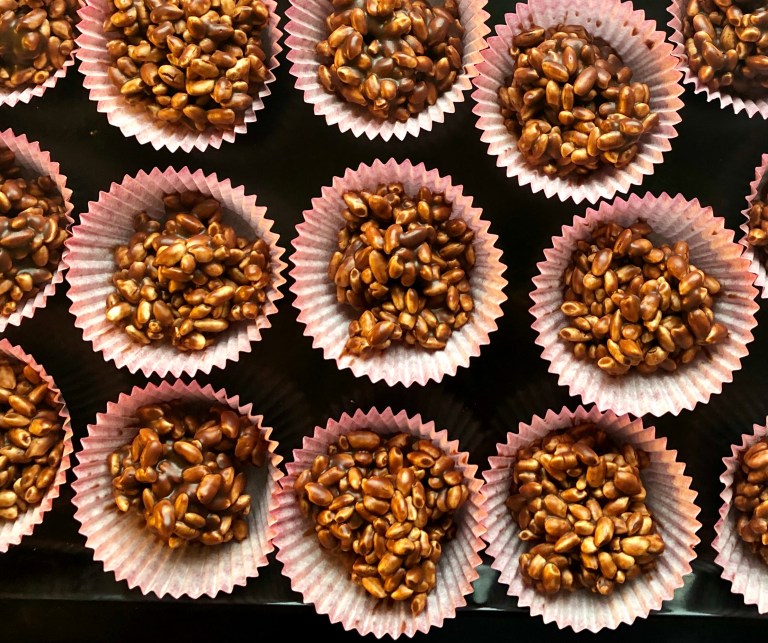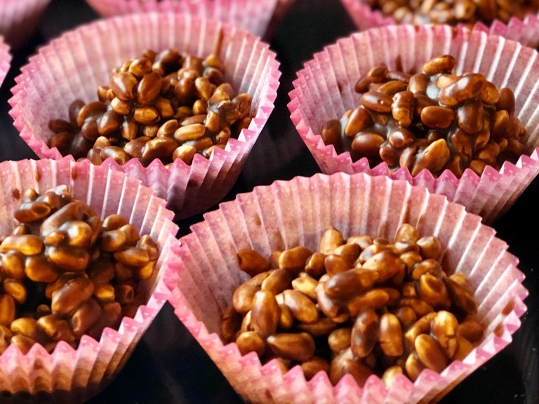 Når alt er godt blandet, uten å overblande, vender du inn puffet ris så alt blir dekket.