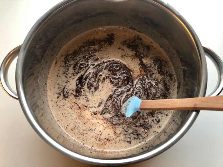 Finhakk sjokoladen og ha det over i den varme fløten.