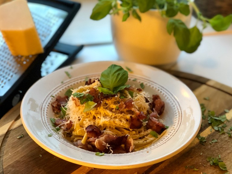 Servèr med resten av parmesanen, bacon og frisk basilikum.
