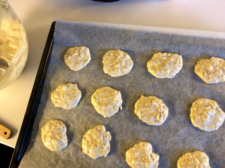 Bruk en teskje og legg små klatter på to stekebrett med bakepapir, 3×4.