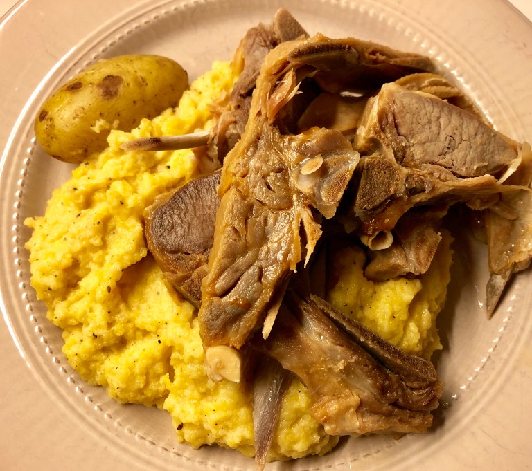 La det koke i ca. 3 timer, til kjøttet faller lett fra benet.