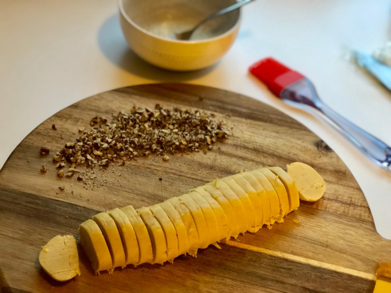 Pensle med eggehvite og strø på hakkede pekannøtter.