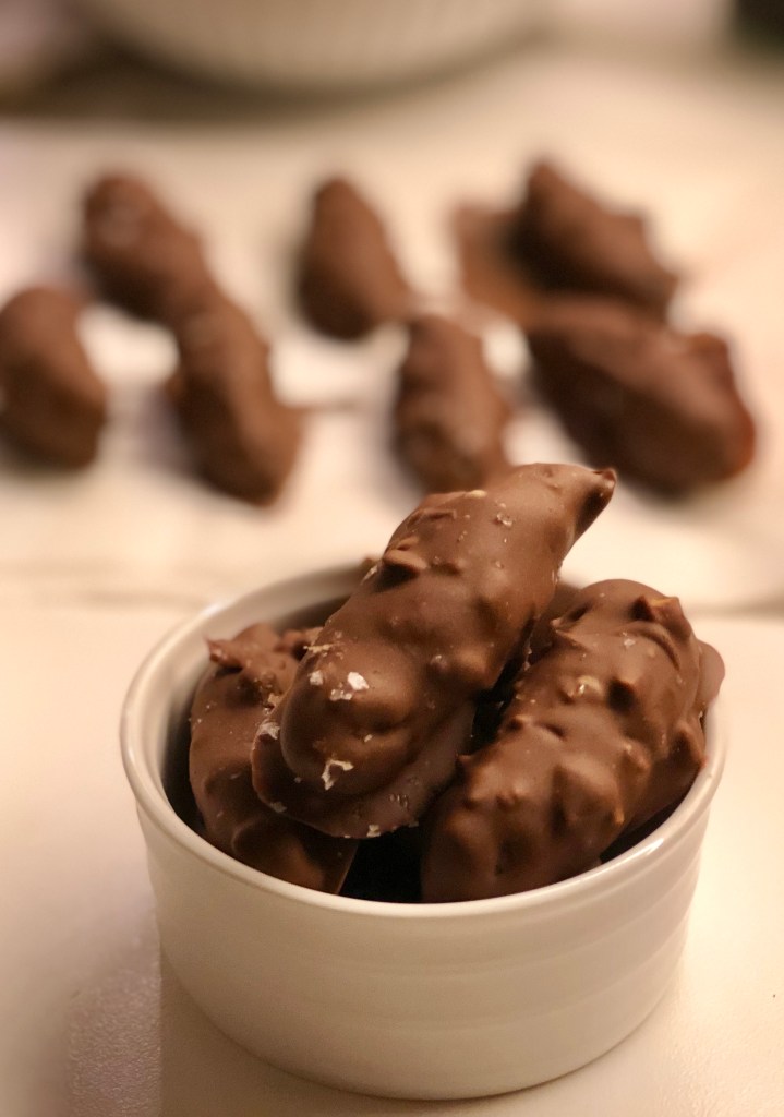 Strø maldonsalt over og sett de i kjøleskapet til sjokoladen er stivnet.