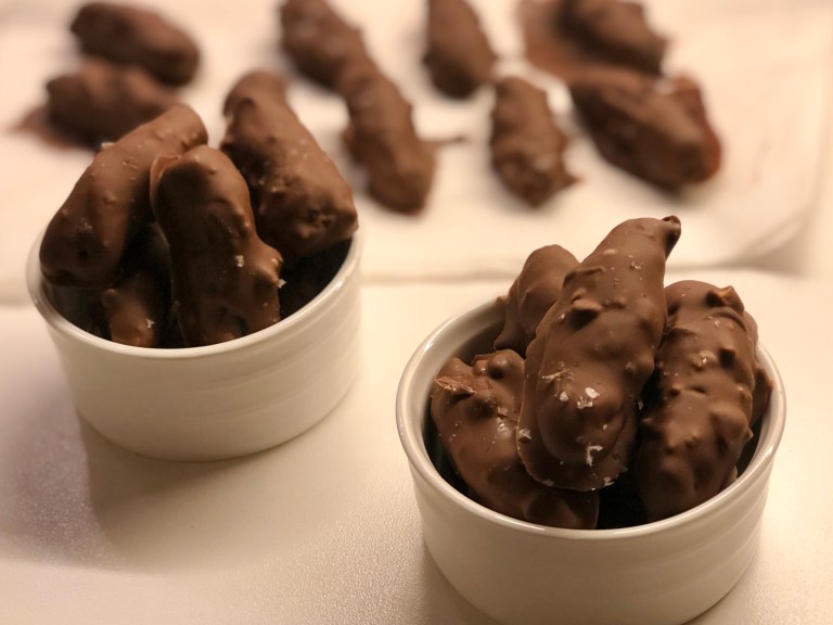 Strø maldonsalt over og sett de i kjøleskapet til sjokoladen er stivnet.
