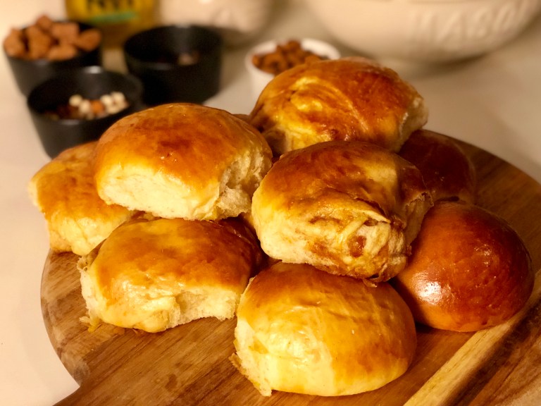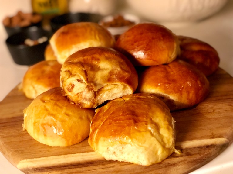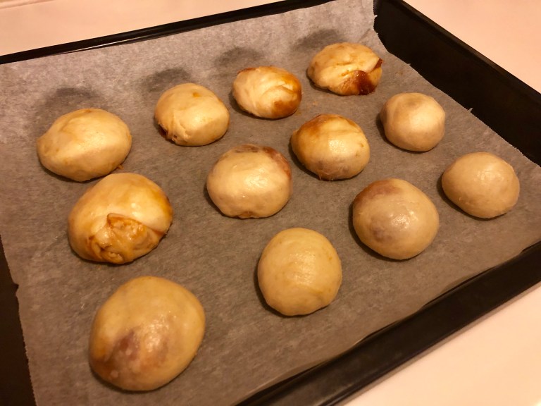 Pensle over med et vispet egg og stek de på varmluft 180 grader i ca. 12 minutter.