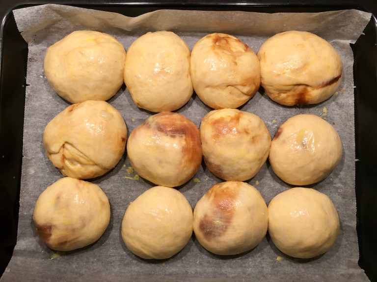 Sett de tett sammen på et stekebrett med bakepapir og dekk til igjen med plastfolie.