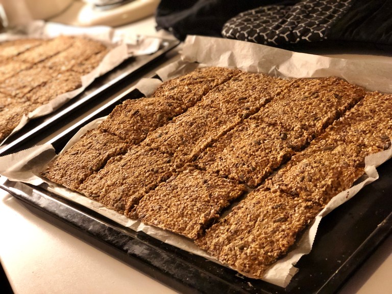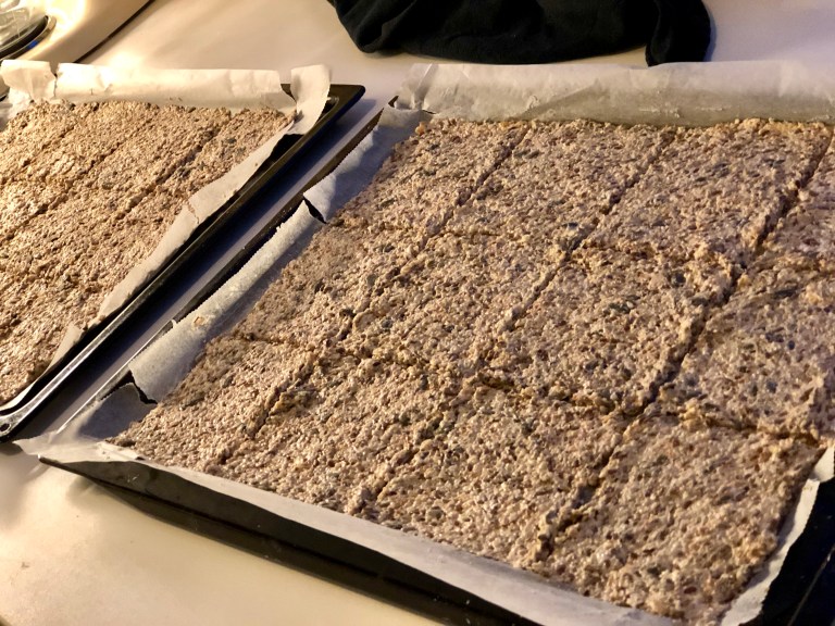 Denne oppskriften gir 24 knekkebrød fordelt på 2 stekebrett.
