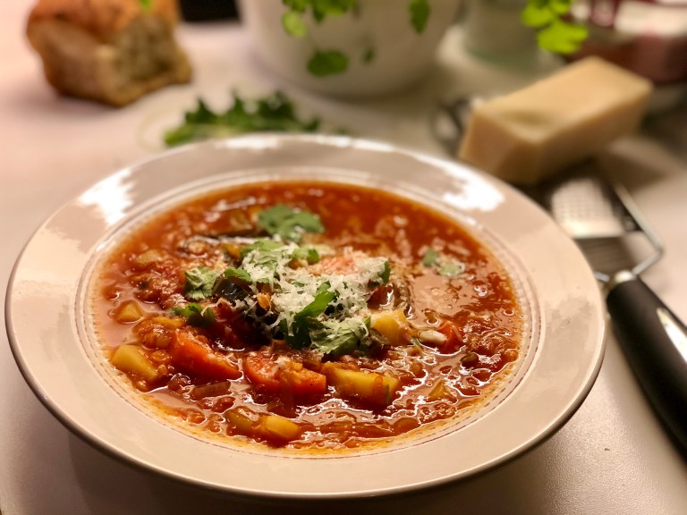 Servèr med grovhakket frisk koriander, revet parmesan og godt brød til!