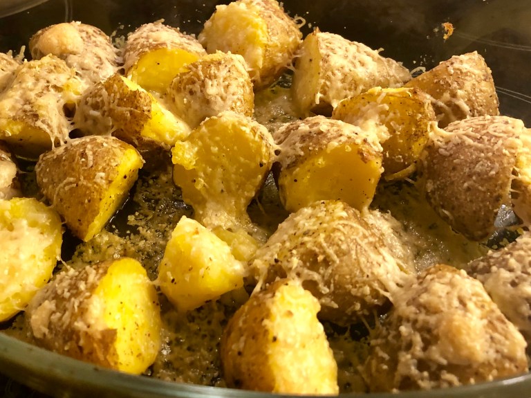 Hell av vannet, del potetene i to og legg de over i en liten langpanne eller ildfast form.