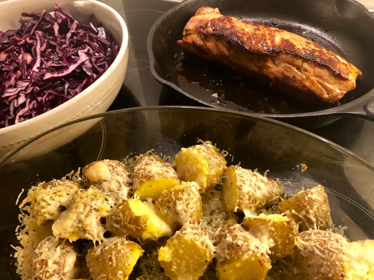 Hell over olje, strø på salt og pepper og bland godt så potetene blir dekket.