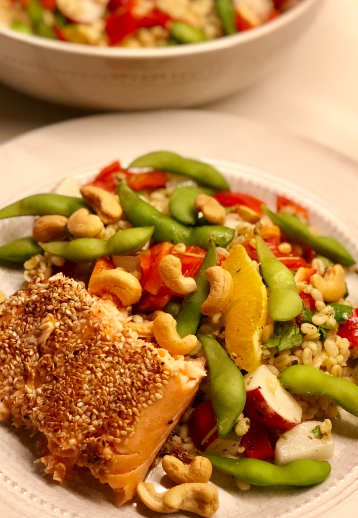 Anrett bulgursalaten på tallerkener, legg stykker av laksen oppå