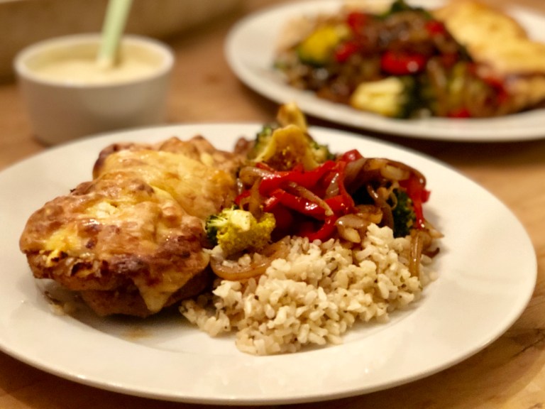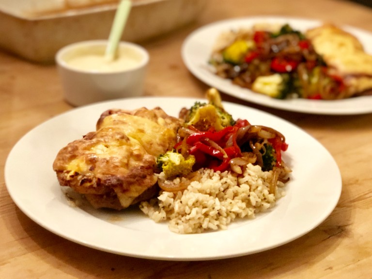 Server dressingen ved siden av koteletter, grønnsakene og brun ris. NYT!