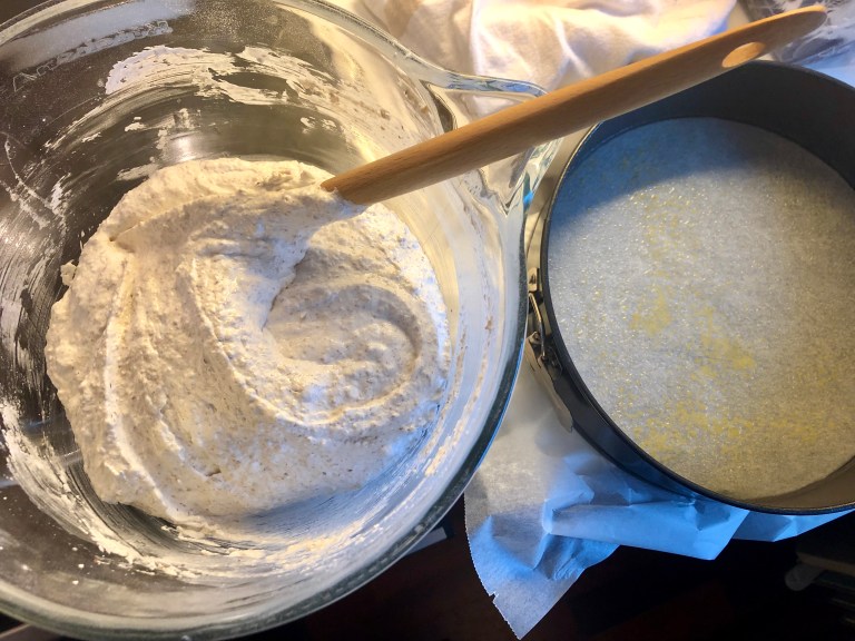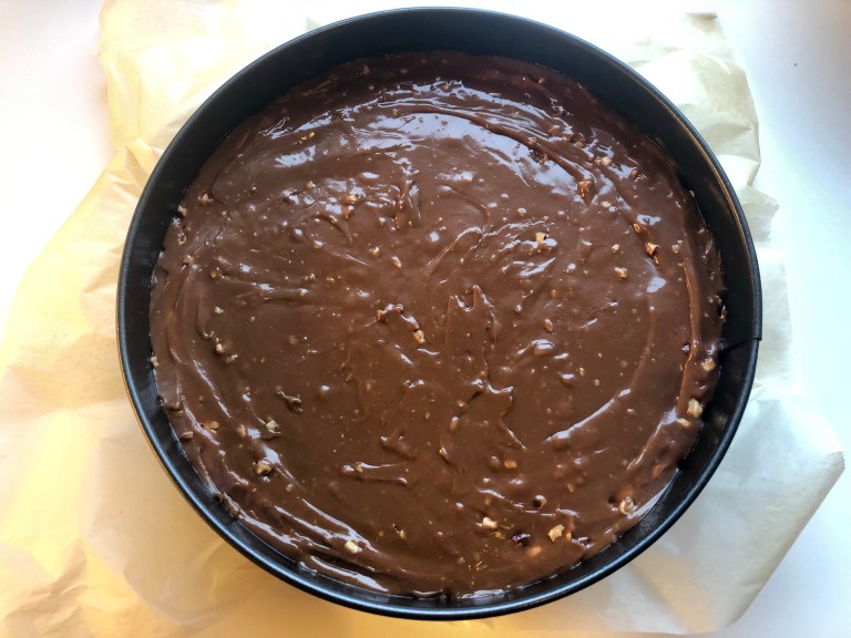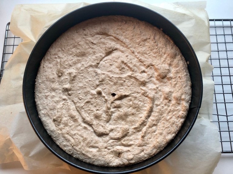 Vend det forsiktig sammen og hell røren i en smurt rund form, 26 eller 28 cm.