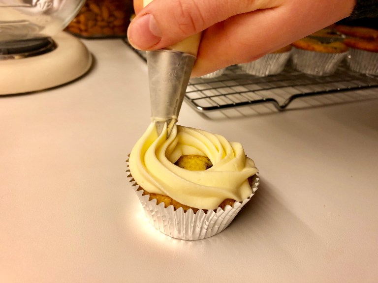 Ha frostingen over i en sprøytepose og pynt avkjølte cupcakes.