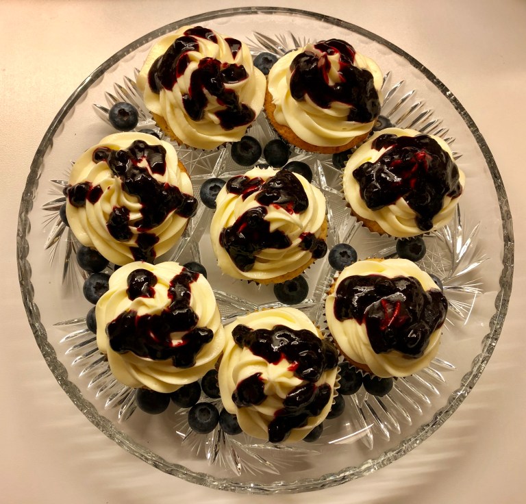 og blåbær toppet med en nydelig hvit sjokolade frosting.