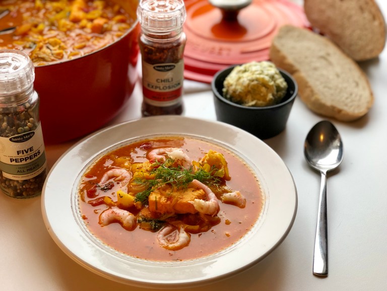 Bouillabaisse er en fransk fiskesuppe som lages med flere fiskeslag.