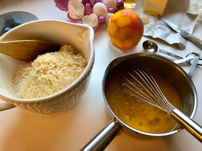 Ta kjelen av platen og rør inn sukker, vanilje, rom, appelsinskall og eggene.