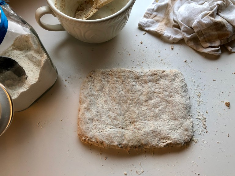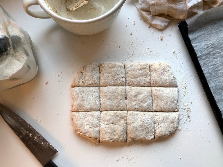 Form deigen til et kvadrat, 2-3 cm høy og kutt et rutenett på 3×4, med en kniv.