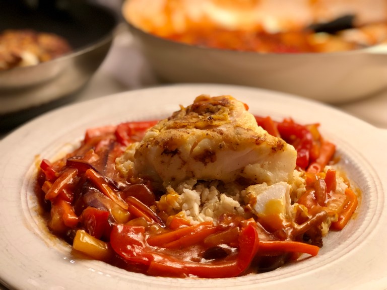Server varm pannestekt torsk med kokt brun ris og sursøt saus.