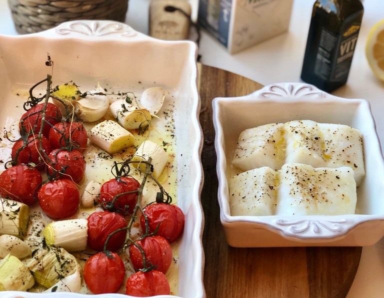 Fisken settes inn i ovnen de siste 10-12 minuttene før tomatene er ferdige.