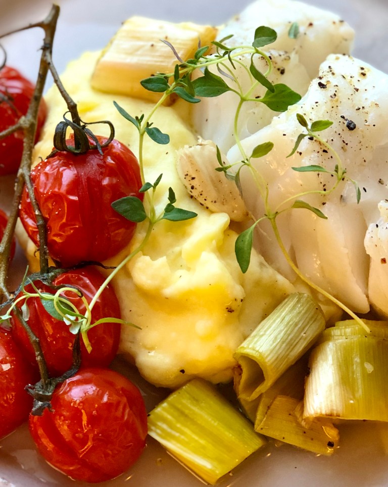Server potetmos med fisken oppå sammen med tomat og purre.