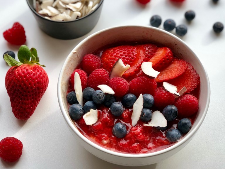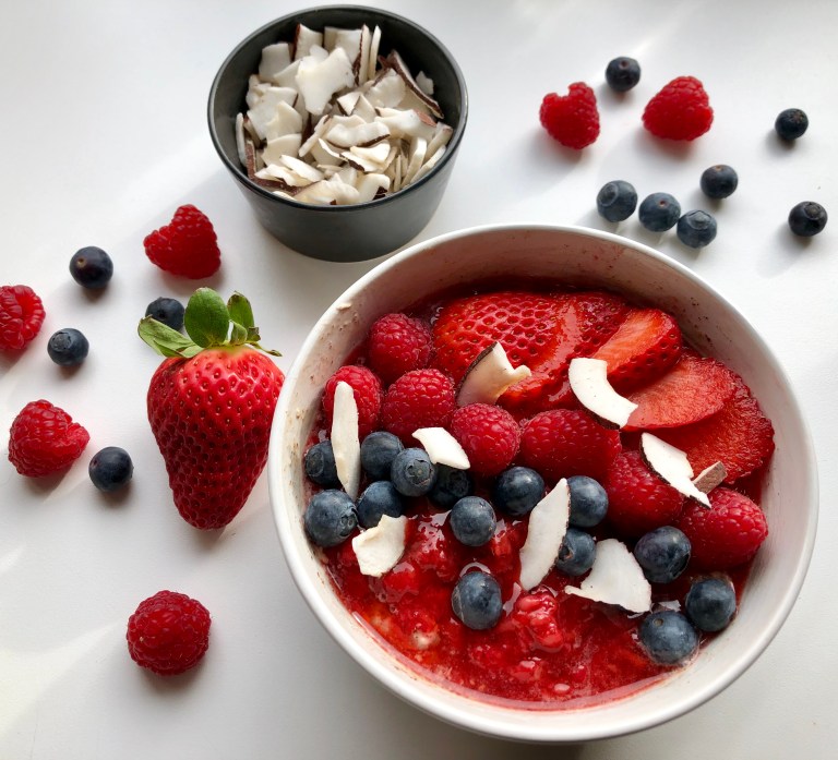 Ha på rørte jordbær, bær og kokosflak.