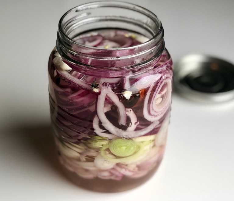 Når sukkeret er helt oppløst helles det over rødløk, sjalottløk og purre.