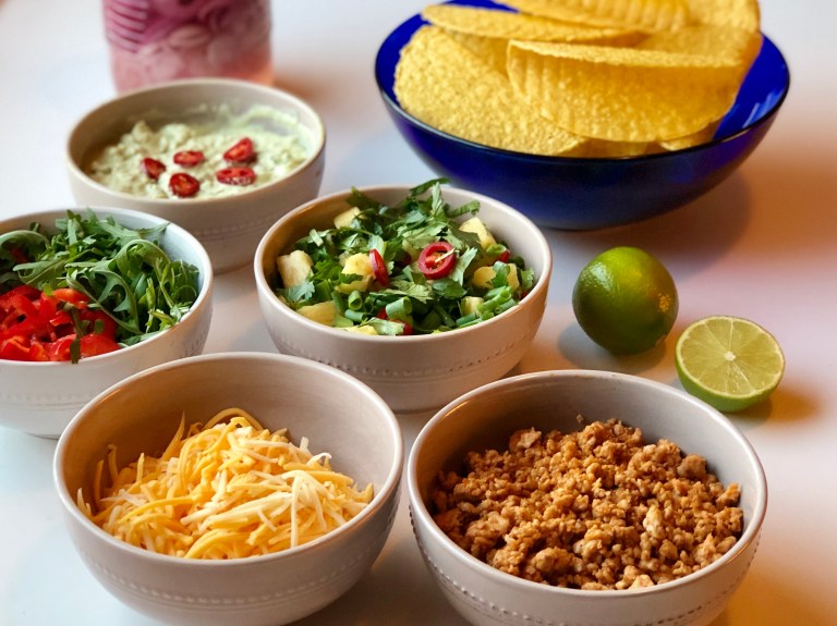 i tacoskjell og topp det med en skvis lime, hakket koriander og revet ost.