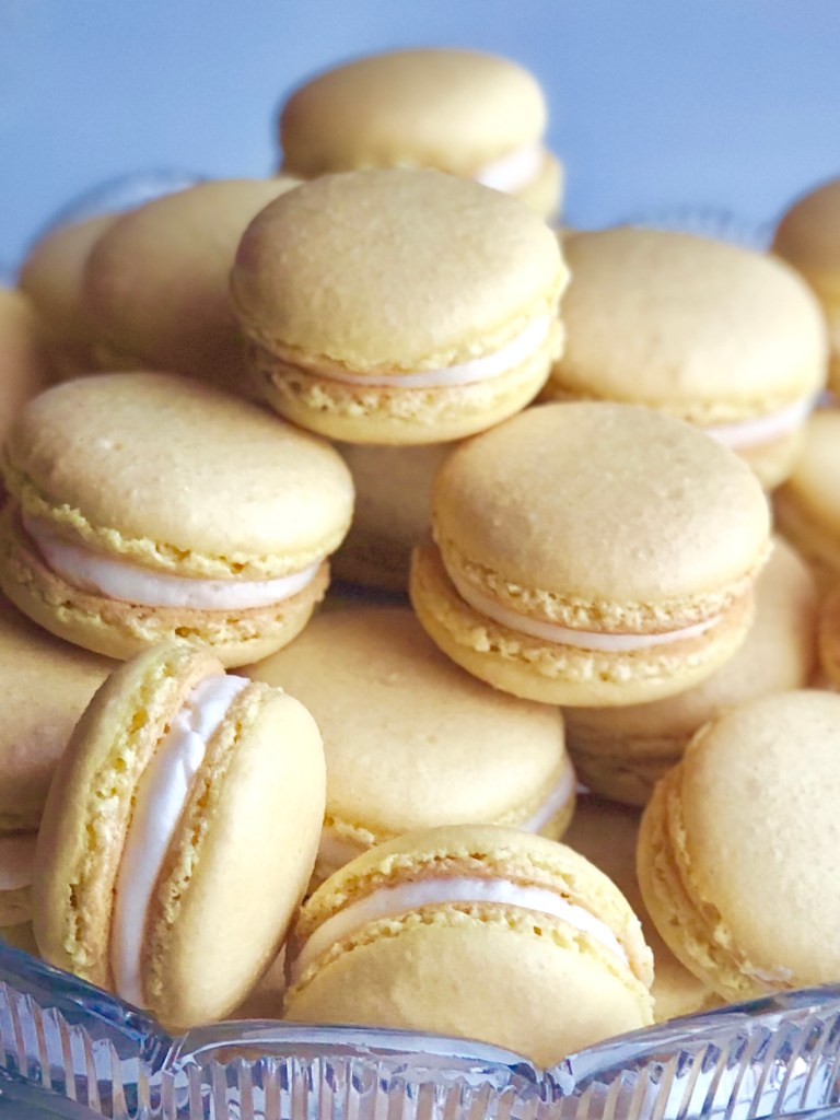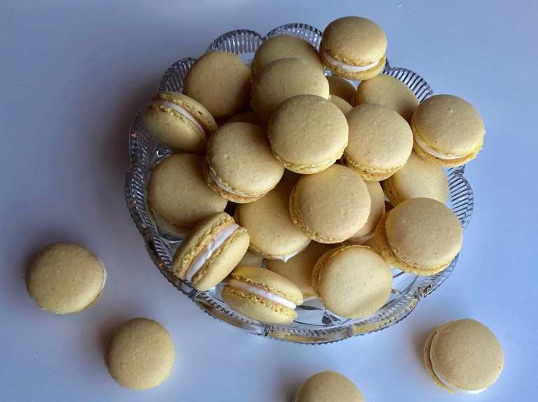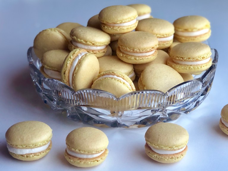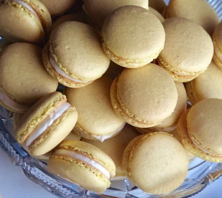 Til påske har jeg farget vaniljemakronene gule og fyllt de