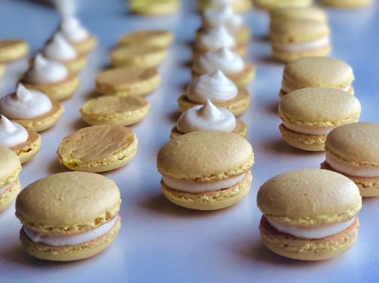 andre halvparten av makronene oppå vaniljekremen og klem forsiktig sammen.