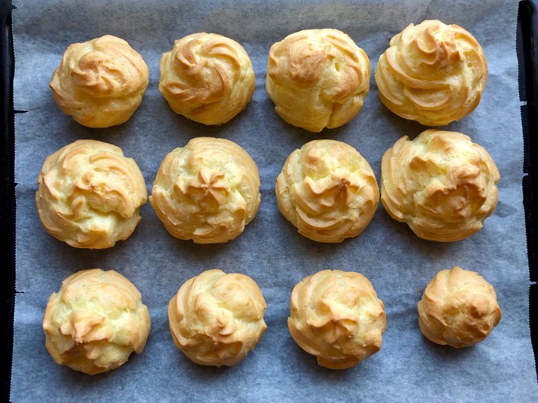 Form profiteroles på størrelse med en liten bolle på et stekebrett med bakepapir.