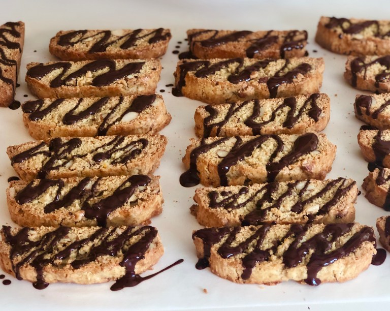 Smelt sjokoladen over vannbad og dryss over biscottiene i ønsket mønster.