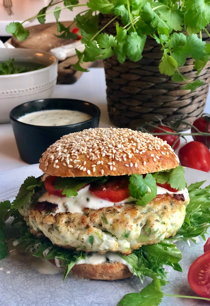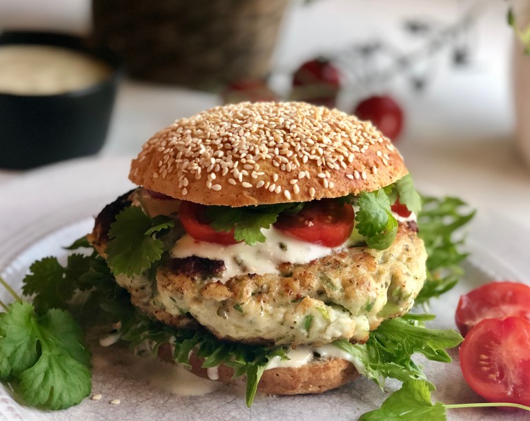 Servert i glutenfrie hamburgerbrød og med en nydelig frisk dressing!