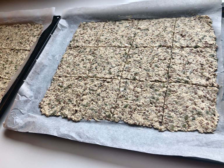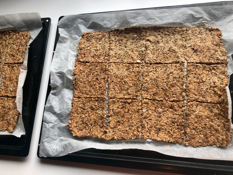Denne oppskriften gir 24 knekkebrød fordelt på 2 stekebrett.