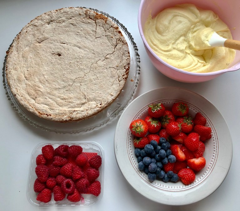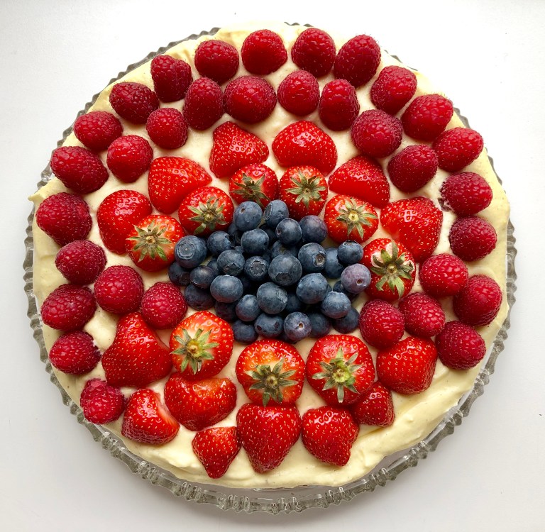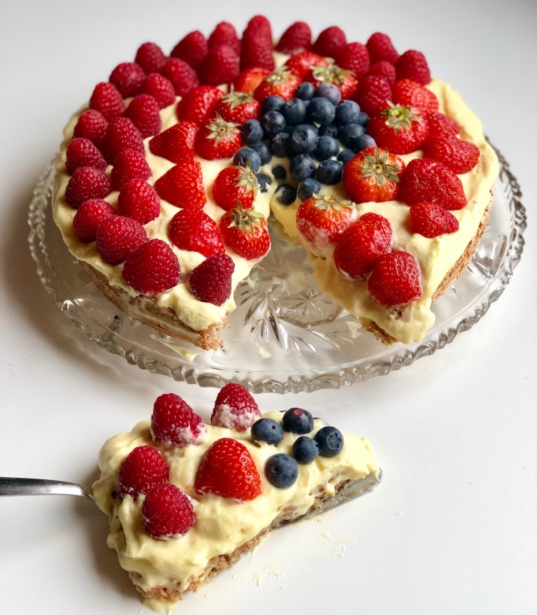 Bre vaniljekrem over mandelbunnen og pynt med friske bær.