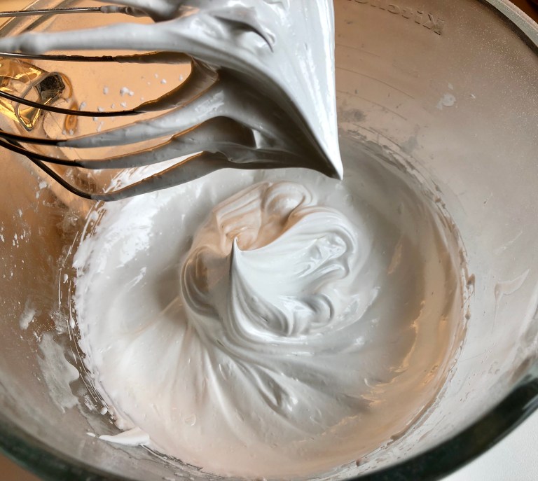 Når det har blitt en blank og stiv marengs har du i mandelmassen.