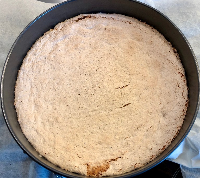 Vend det forsiktig sammen og hell røren i en smurt rund form 24 eller 26 cm.