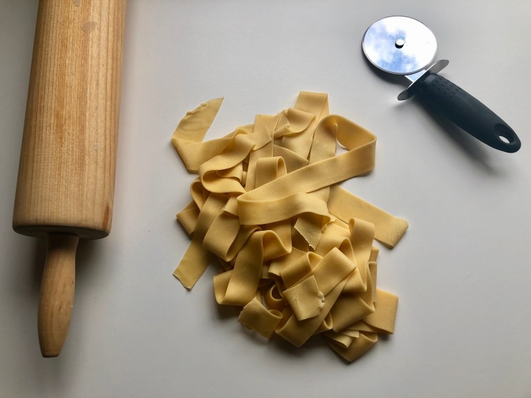 Jeg har laget fersk hjemmelaget pasta, kjevlet ut og laget brede båndpasta.