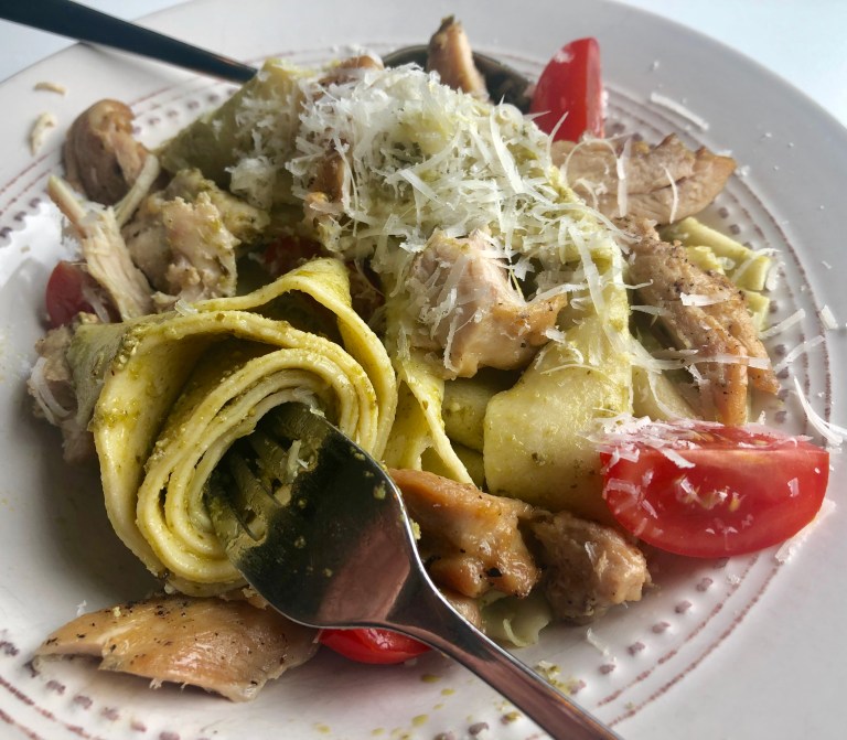 Hell av vannet og bland inn pesto med en gang og legg kyllinglår i skiver over.