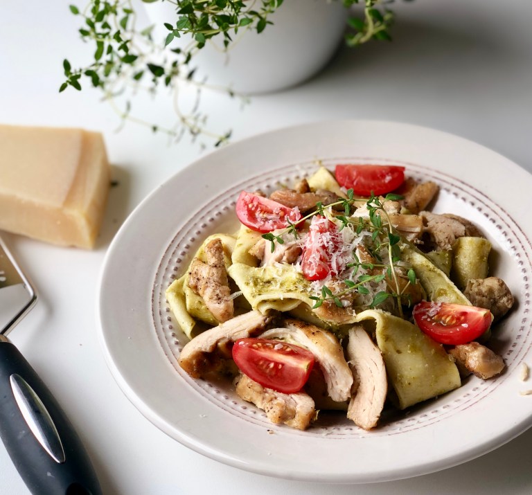 Hell av vannet og bland inn pesto med en gang og legg kyllinglår i skiver over.