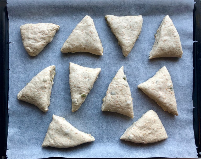 Form en lang pølse, trykk den litt flatere, kutt på skrå så du får former som trekanter.
