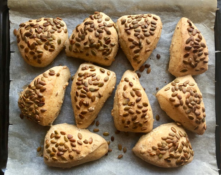 Pisk egg og vann sammen, pensle over og strø på gresskarkjerner. Trykk de lett ned.