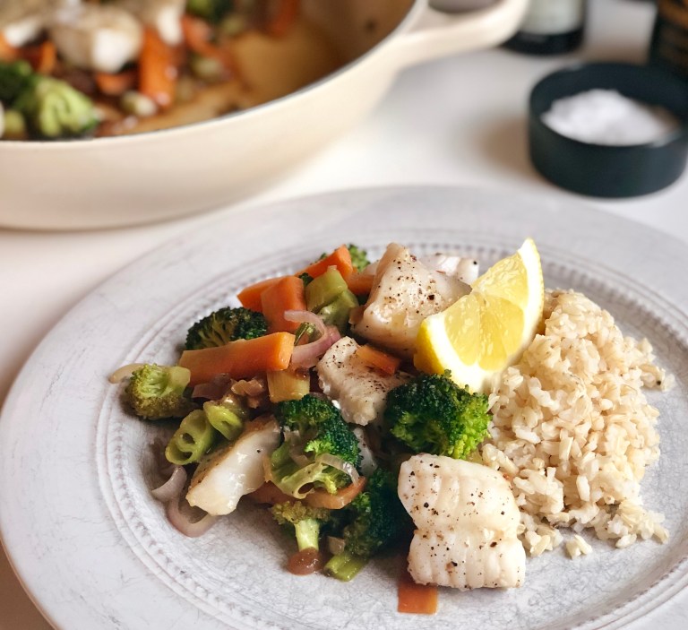 Kutt fisken i terninger på 3×3 cm. Sett til side.